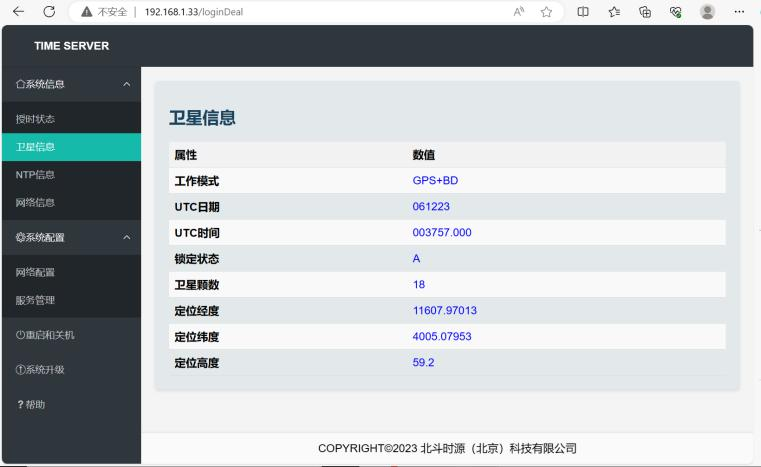打开浏览器,在地址栏输入时钟同步服务器地址,登录时钟管理页面,可以查看系统信息(授时状态、卫星信息、NTP信息、网络数据)、系统配置(网络配置、服务管理)、重启关机、系统升级和帮助等监控管理功能。